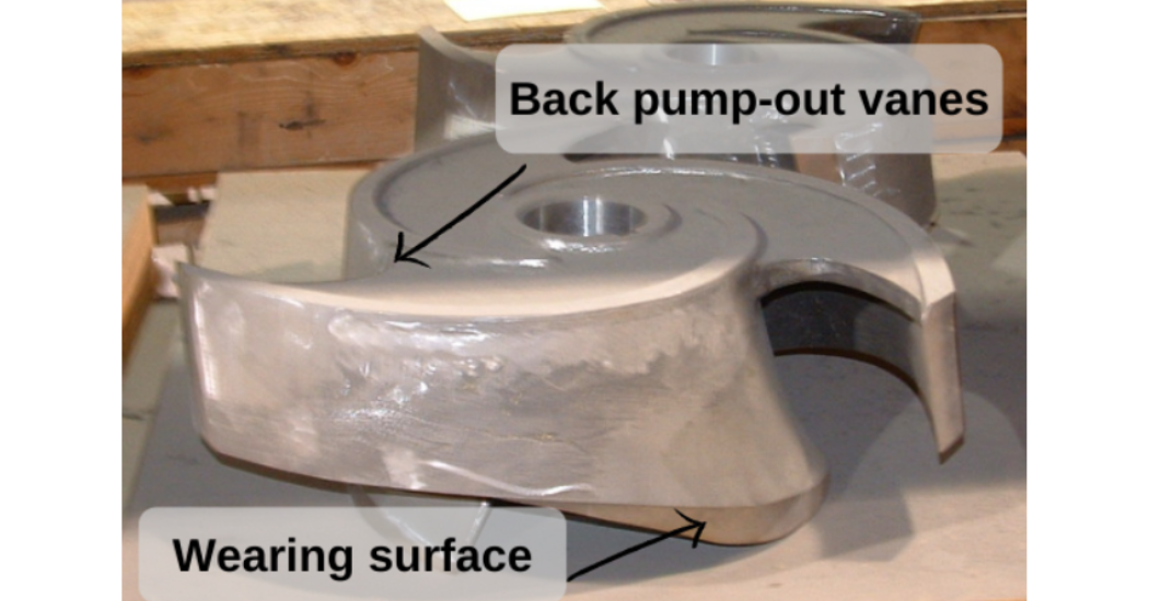 然而,隨著葉輪向吸入耐磨板的方向調(diào)整,葉輪后面的間隙會(huì)增加。大多數(shù)開式葉輪在非泵送側(cè)都有小葉片,稱為“背抽葉片”。這些葉片就像另一個(gè)離心泵一樣,其目的是保持填料函的低壓。如果沒有這些葉片,填料函壓力將接近泵的排放壓力,這可能導(dǎo)致填料污染和填料壽命降低。